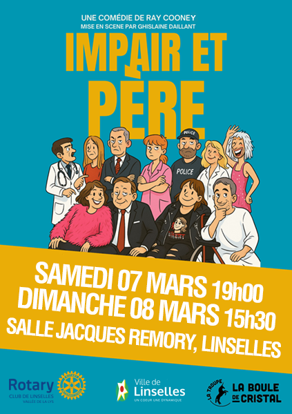 Les samedi 7 et dimanche 8 mars 2026, la Salle Jacques Rémory a accueilli la comédie « Impair et père » de Ray COONEY, mise en scène par Ghislaine DAILLANT et brillamment interprétée par la troupe La Boule de Cristal !